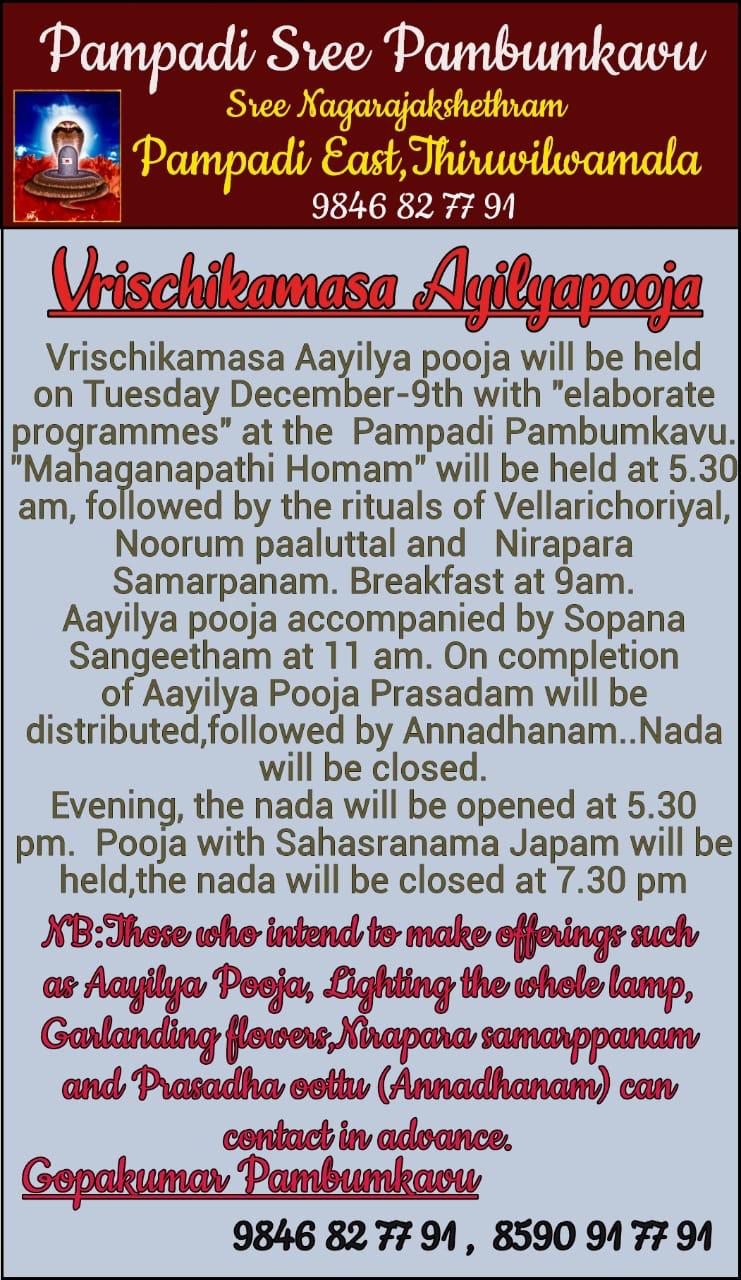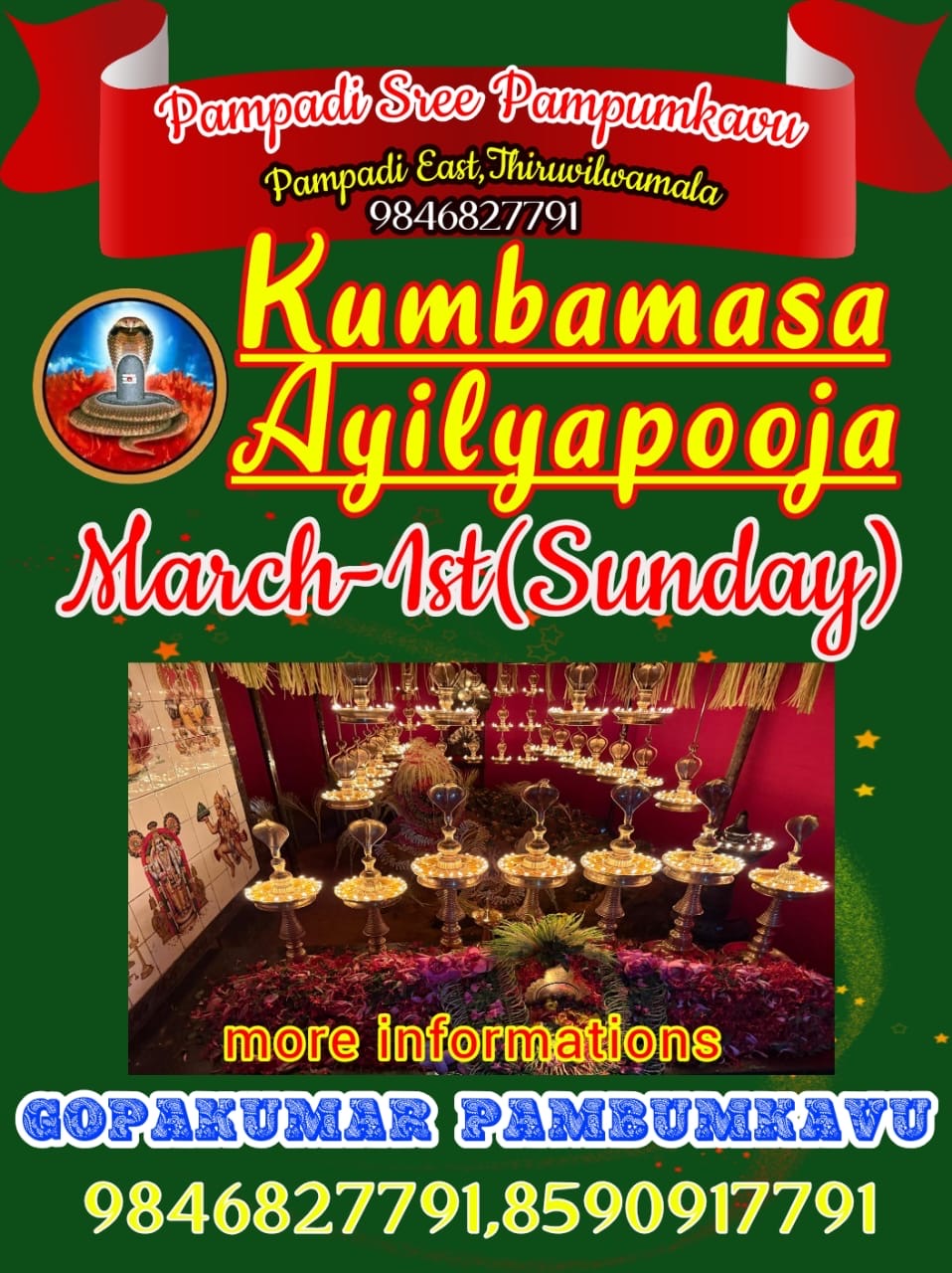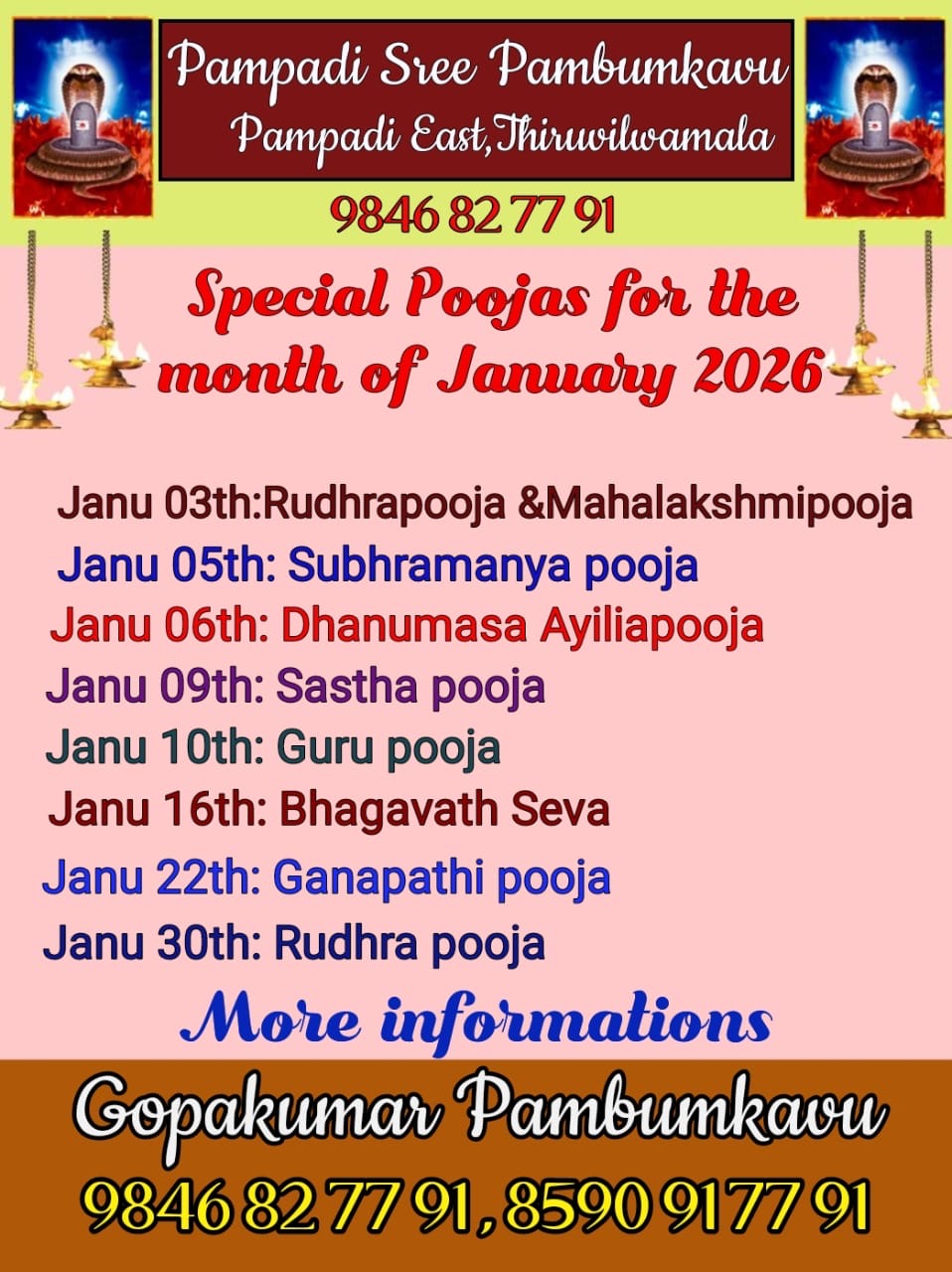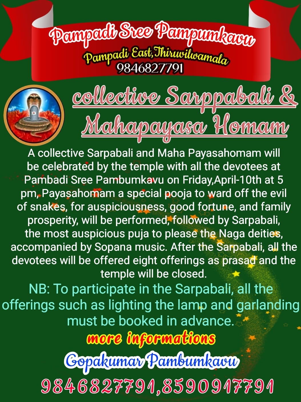 Pampady Pambum Kavu (Sree Nagaraja Kshetram) is a popular Nagaraja temple located in Thiruvilwamala, Thrissur district, Kerala. It is one of the prestigious Naga temples in Kerala, where the custom of snake worshipping goes back to remote antiquity.