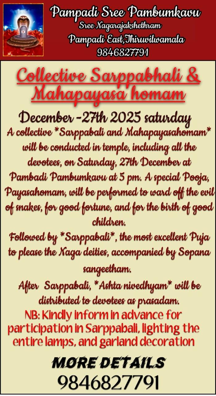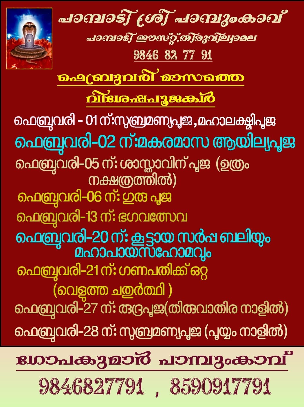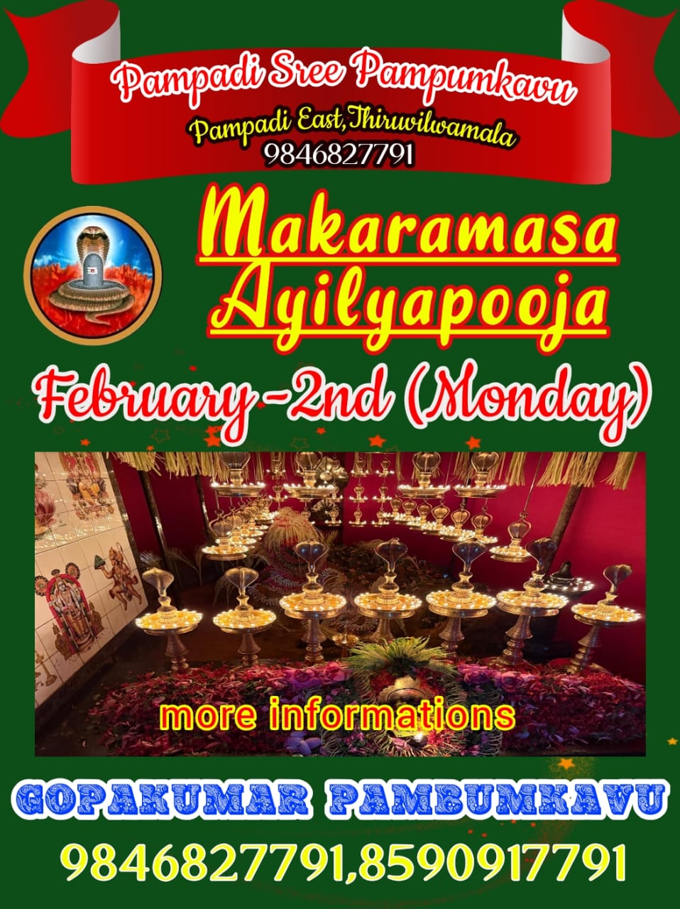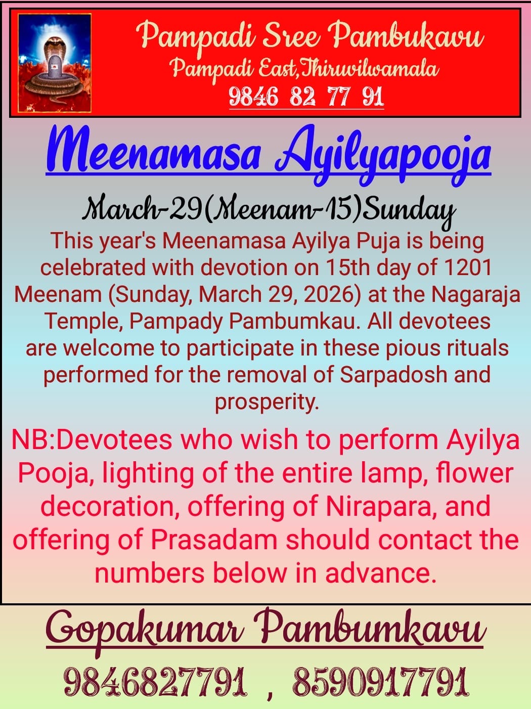 Pampady Pambum Kavu (Sree Nagaraja Kshetram) is a popular Nagaraja temple located in Thiruvilwamala, Thrissur district, Kerala. It is one of the prestigious Naga temples in Kerala, where the custom of snake worshipping goes back to remote antiquity.